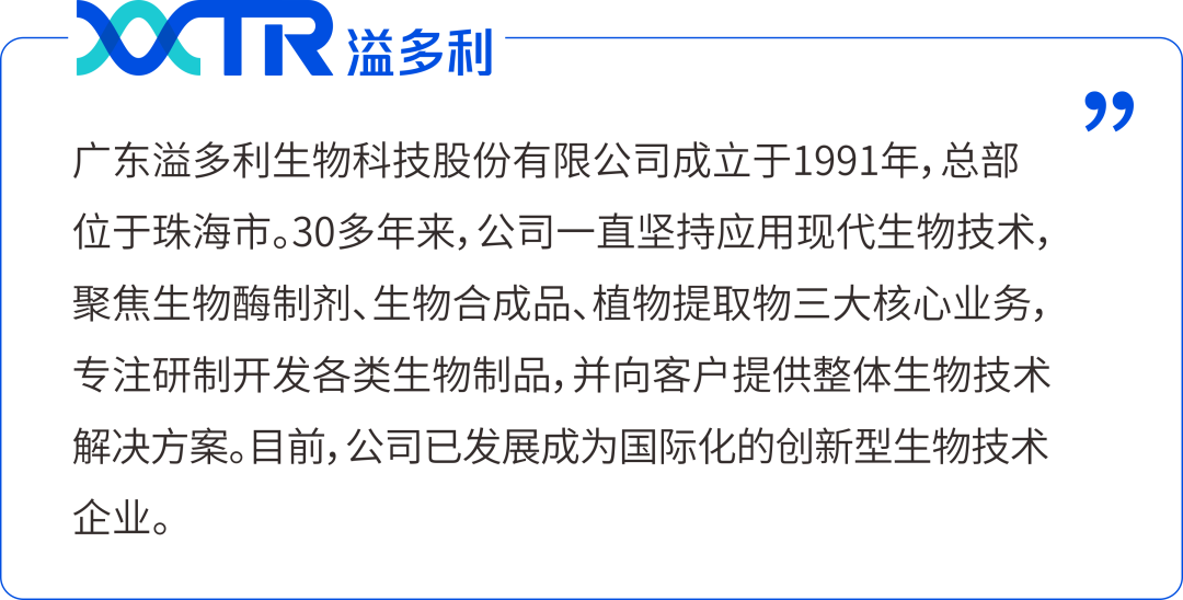 溢多利自1991年成立以來,一直堅持應(yīng)用現(xiàn)代生物技術(shù),聚焦生物酶制劑、生物合成品、植物提取物三大核心業(yè)務(wù),專注研制開發(fā)各類生物制品,并向客戶提供整體生物技術(shù)解決方案,積極提升人類生活品質(zhì)!